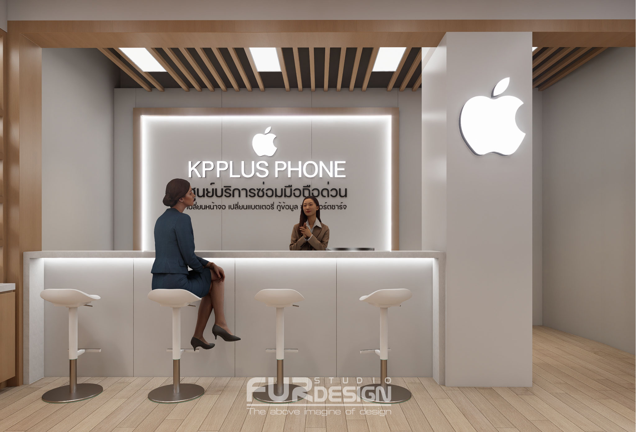 เคาน์เตอร์ Solid Surface สีขาว Backlit ด้วยไฟ LED มีที่นั่ง Bar Stool สำหรับลูกค้า พร้อม Repair Area ด้านหลัง ตกแต่งโดดเด่นด้วยชื่อร้านและ Apple Logo