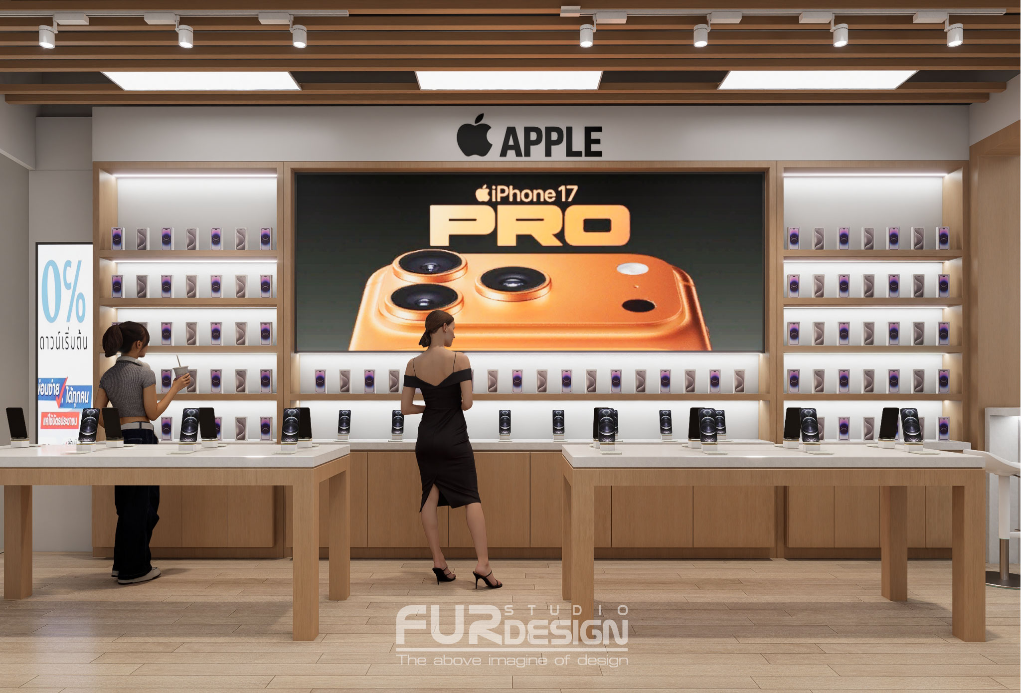 โซน Apple ถูกวางไว้ที่ผนังด้านใน เป็น Focal Point หลักของร้าน ใช้ Backlit Panel ขาวขนาดใหญ่ประดับ Apple Logo + ชื่อร้าน ชั้นวางสินค้าสูงเต็มผนัง บรรจุกล่อง iPhone, Accessories อย่างเป็นระเบียบ มี Digital Screen แสดงภาพ iPhone 17 Pro