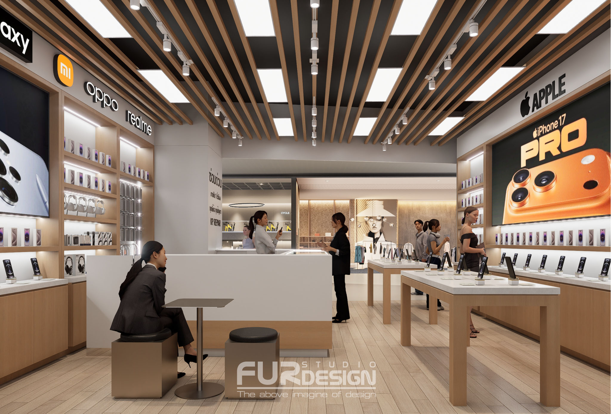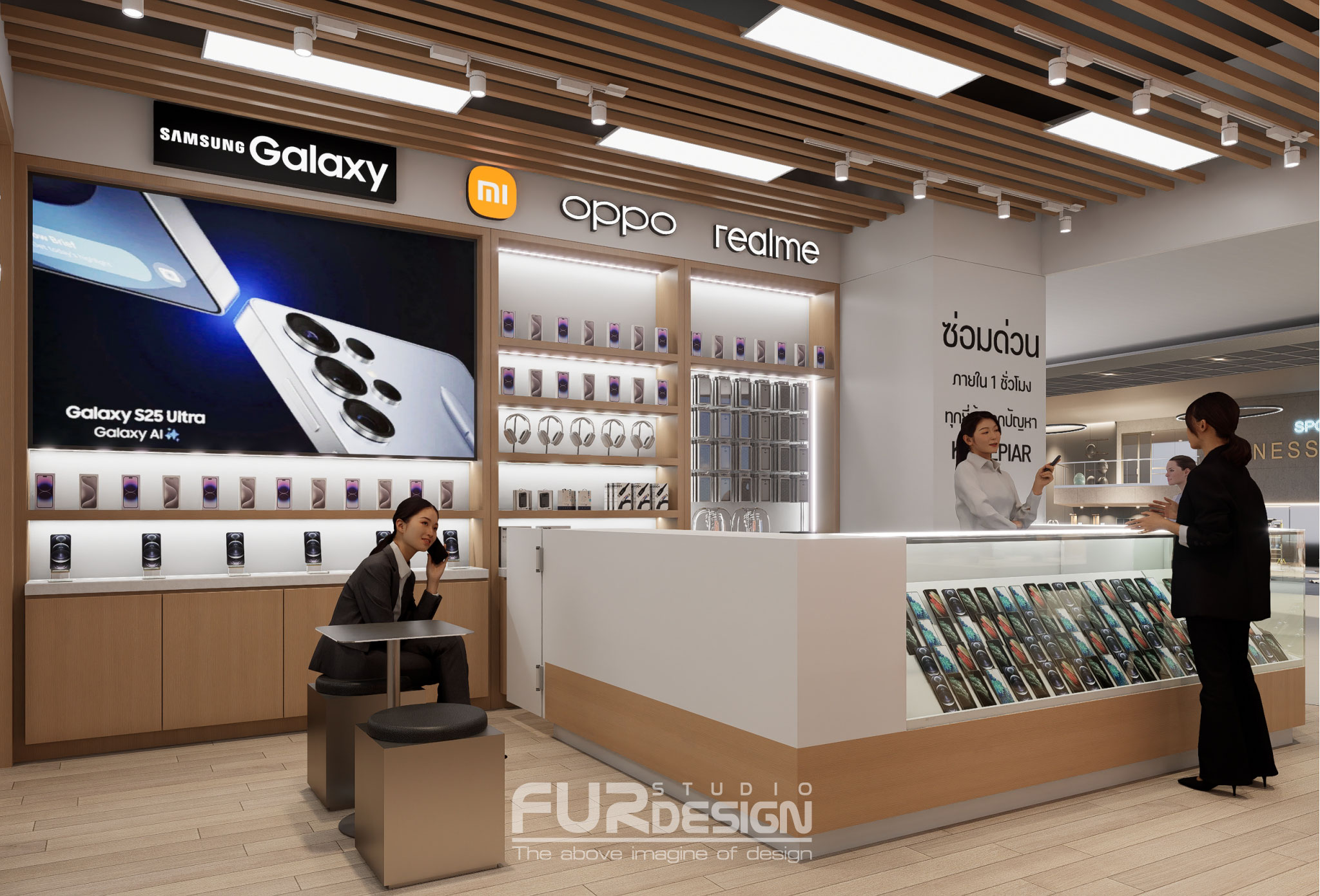 วิเคราะห์การออกแบบอินทีเรียร้านจำหน่ายและซ่อมมือถือในรูปแบบ Modern Tech Retail ที่ผสาน Warmth ของงานไม้กับความสะอาดของ Minimalist